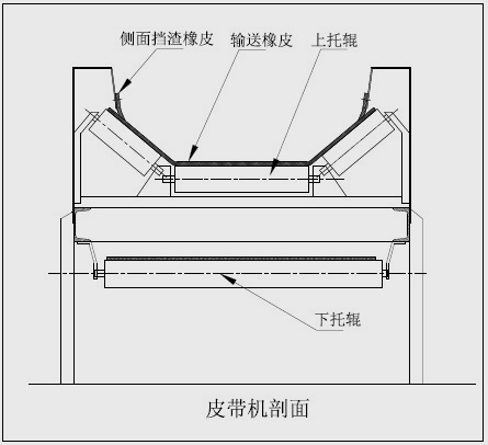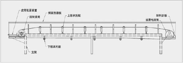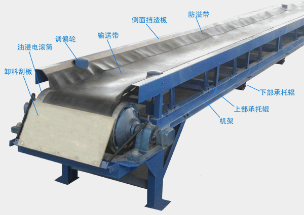 油浸電滾筒(傳動電機)帶動輸送皮帶在承托輥上運動,落入帶上的固體物隨輸送帶一起運動,一直輸送到帶的另一端,完成輸送過程。 帶式輸送機主要由油浸電滾筒、副滾筒、機架、輸送帶、上部承托輥、下部承托輥、調偏滾、裝緊裝置、卸料板等組成。