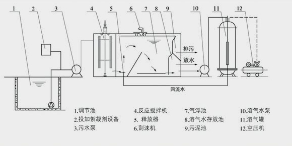 加壓溶氣氣浮在國內(nèi)外應(yīng)用廣泛,該法師將原水加壓至0.3~0.4MPA,同時(shí)通入空氣,使空氣溶解與水中并達(dá)到相應(yīng)壓力狀態(tài)下的飽和值,然后驟然減至常壓,溶解于水中的空氣以微小氣泡的形式從水中釋放出來,氣泡直徑約為Ø20~Ø100μm左右,目前的基本流程有全部進(jìn)水加壓溶氣氣浮、部分進(jìn)水加壓溶氣氣浮、部分處理水回流加壓溶氣氣浮等三種,都是由加壓泵、溶氣罐、釋放器和氣浮池等基本設(shè)備組成。