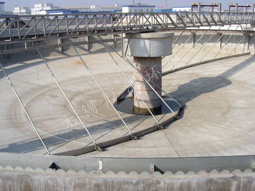 原水從池底經(jīng)中心支墩上不流出,并經(jīng)穩(wěn)流筒配水后,呈輻射狀流向池子周邊集水槽出水,隨著輻向流速的降低,原水中的懸浮物被分離而沉降于池底。工作橋以中心支座為圓心,帶動刮泥、排渣機構(gòu),在驅(qū)動裝置驅(qū)動下將污泥刮集至沉淀池中心集泥槽,依靠水壓或泵排出池外,上部浮渣由刮渣板同步刮至排渣斗排出。